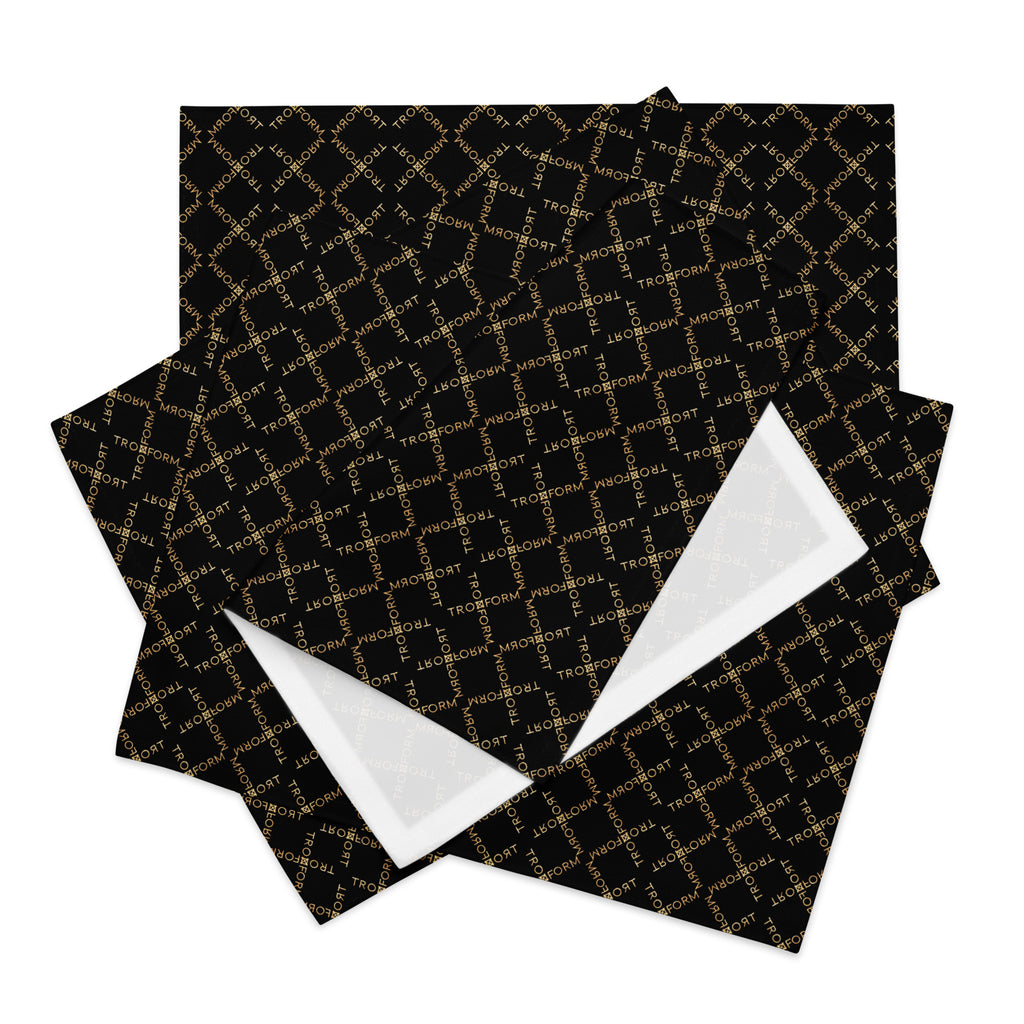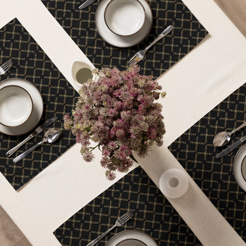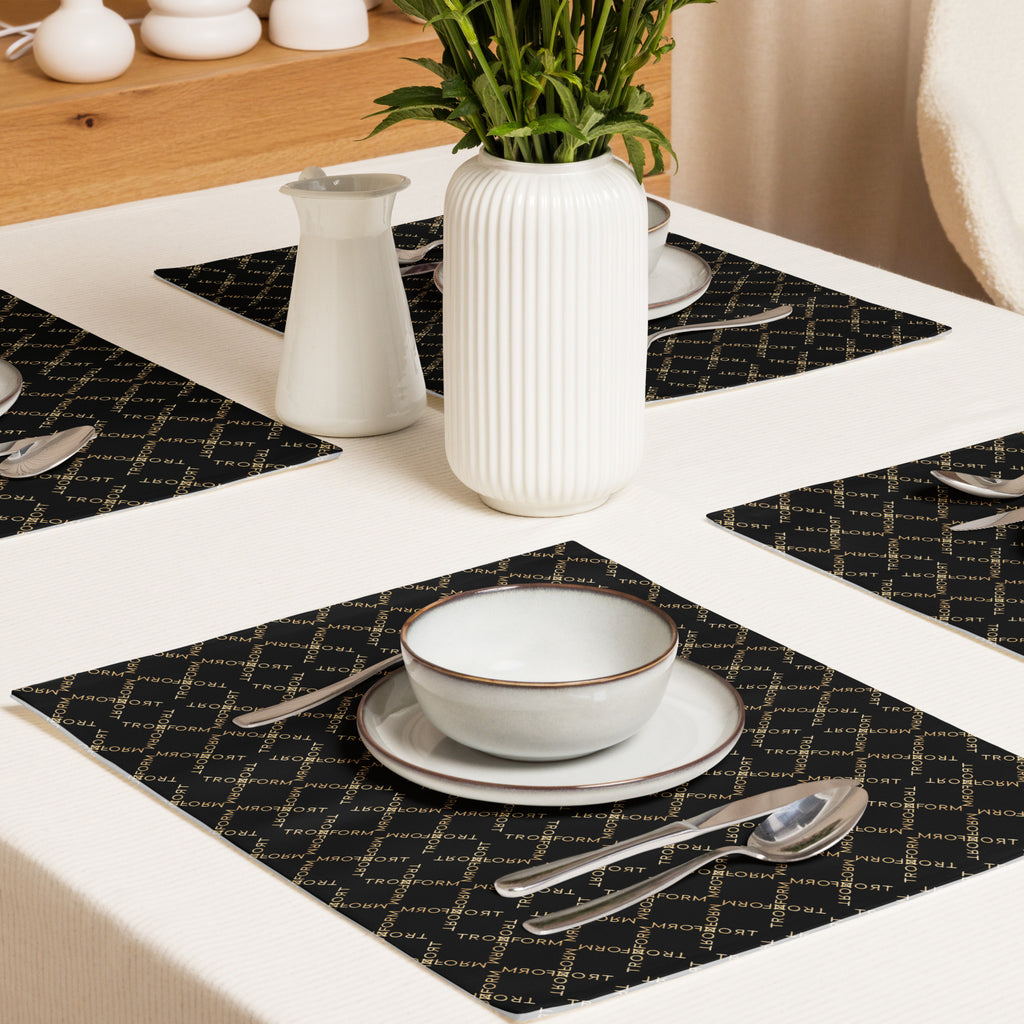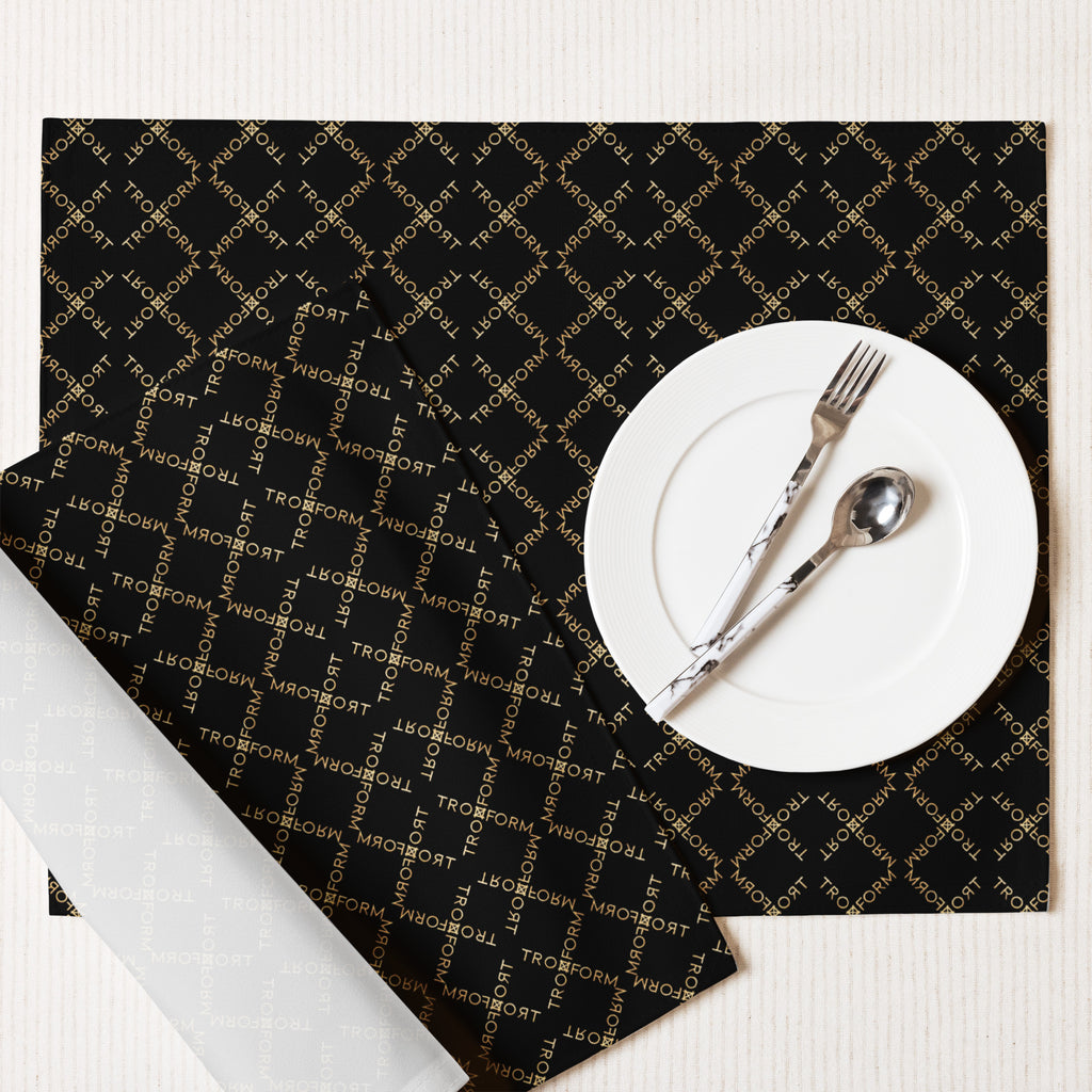 Redefine your dining presence with the TRONFORM TF Luxe Placemat Set. Where opulence meets precision. This piece features our signature lattice X TF pattern in bold black and gold, creating a table presence that speaks volumes. Built with water-resistant durability and sewn two-ply for enhanced structure, these placemats turn any setting into a luxury experience.