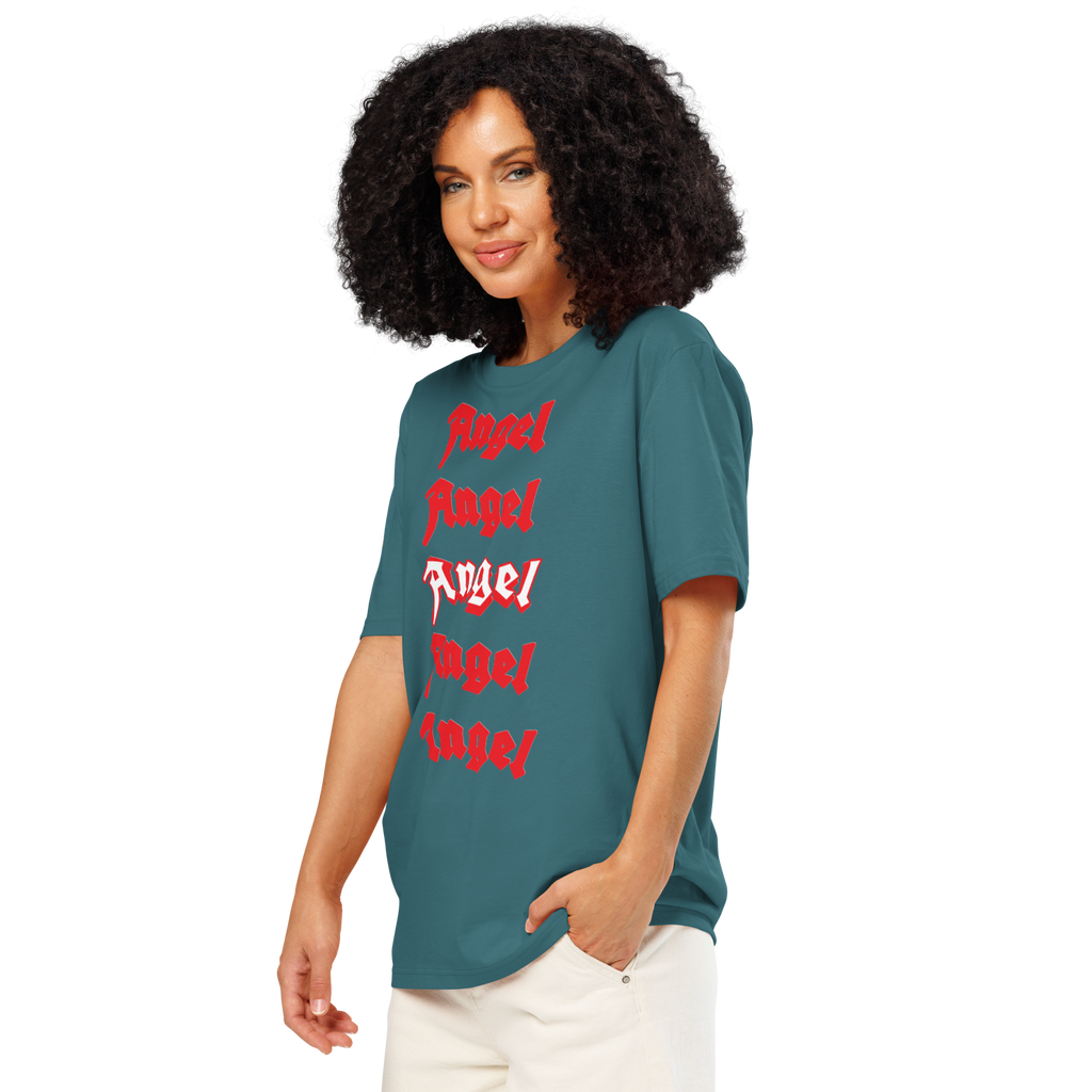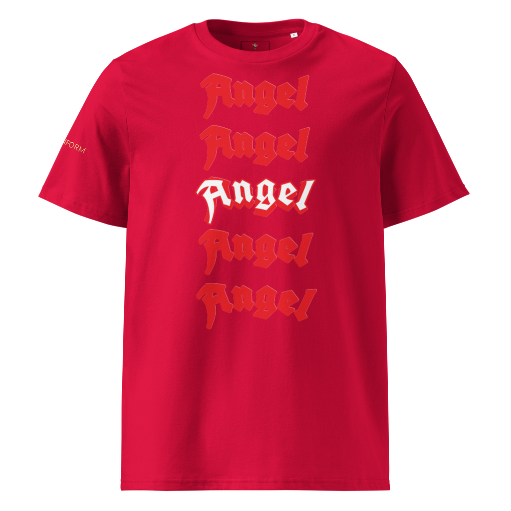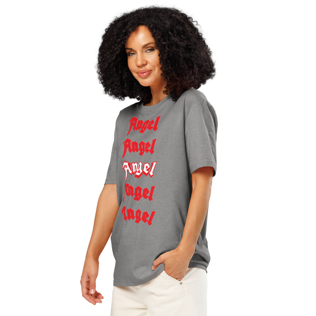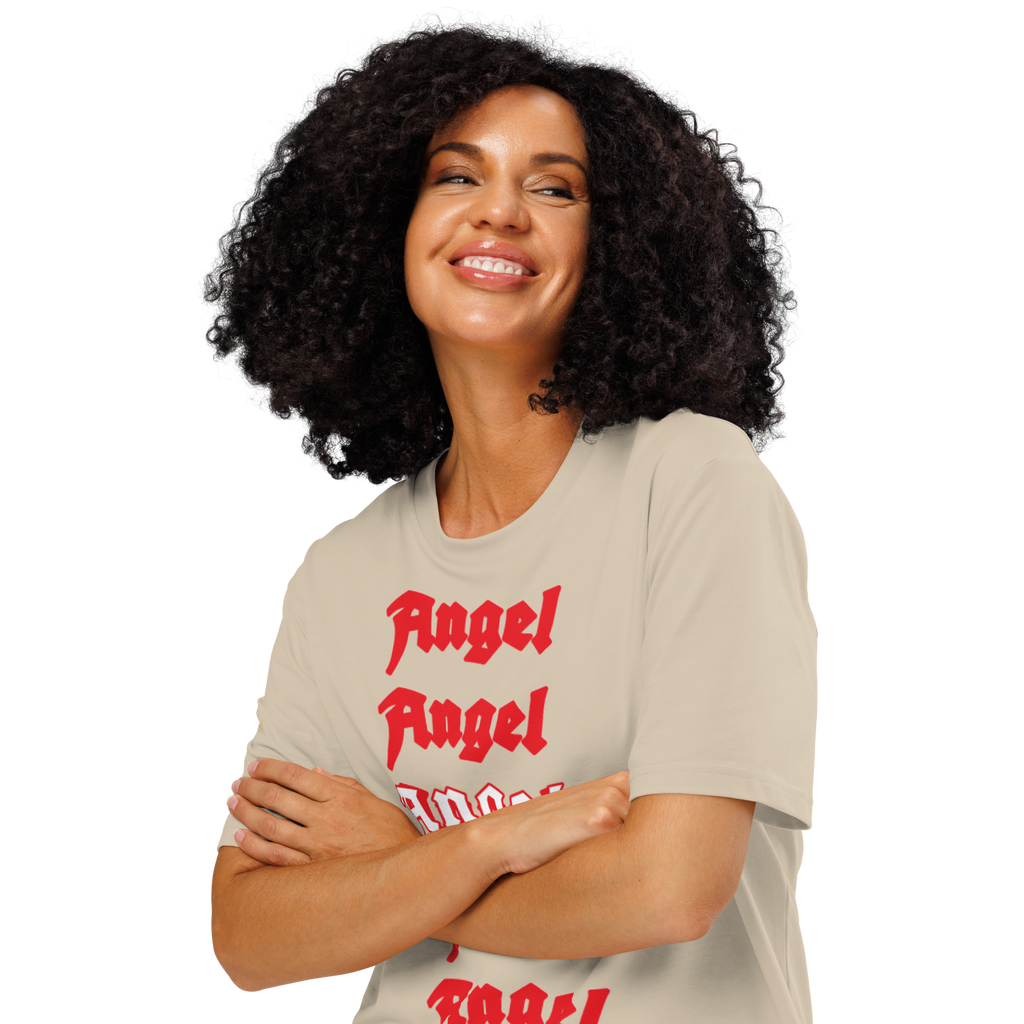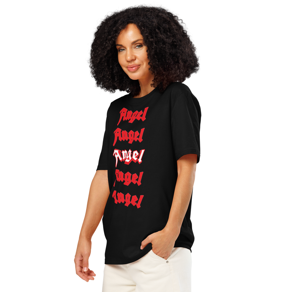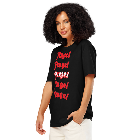• Gothic Angel Stack Design Five bold red Angel prints layered in vertical alignment—symbolizing grace, defiance, and hidden truth