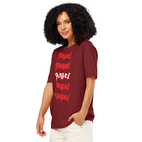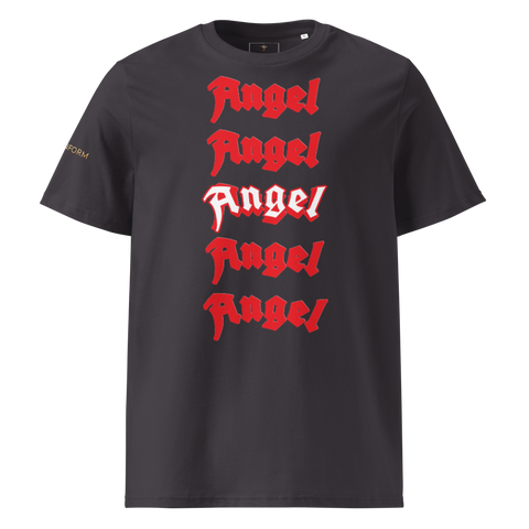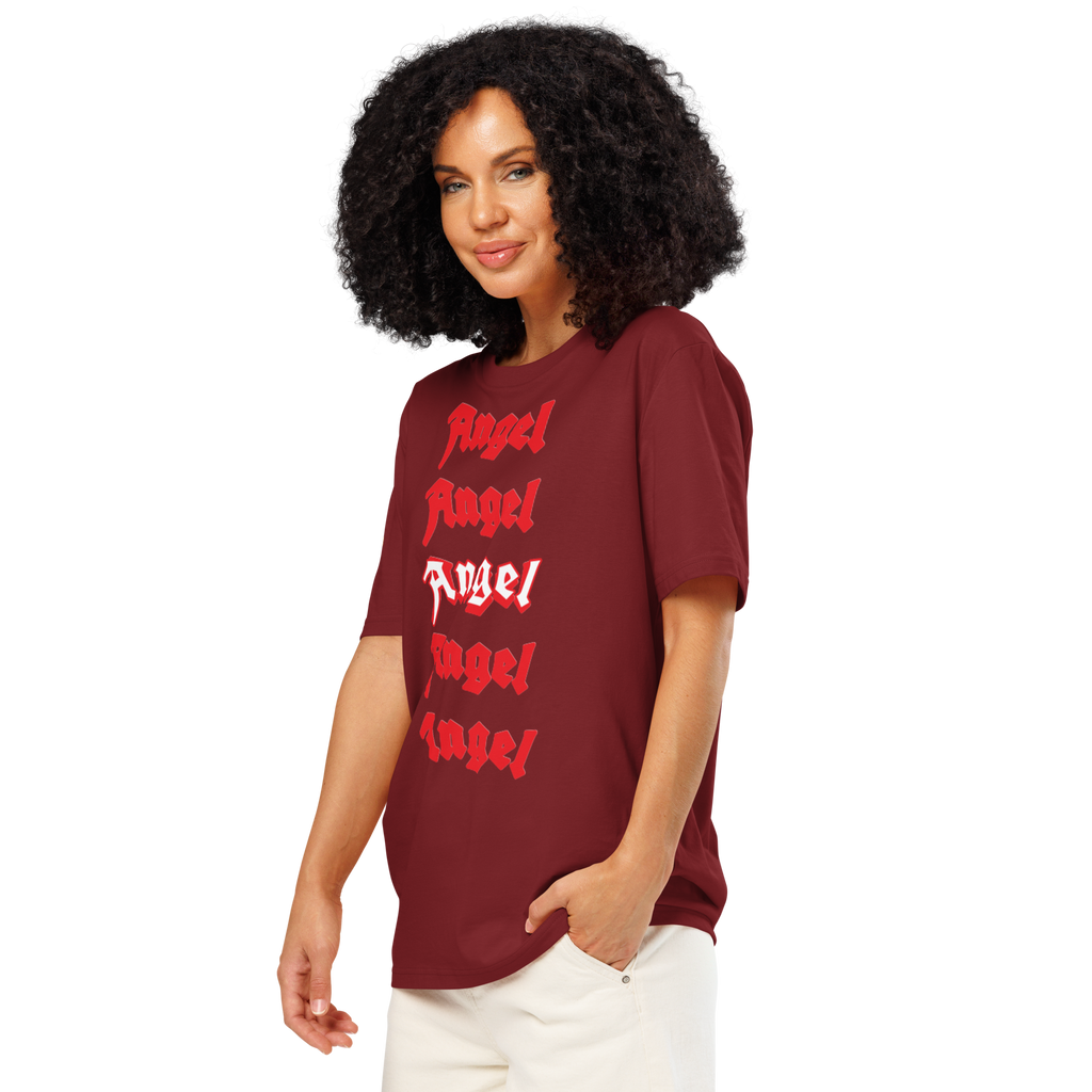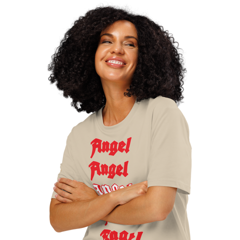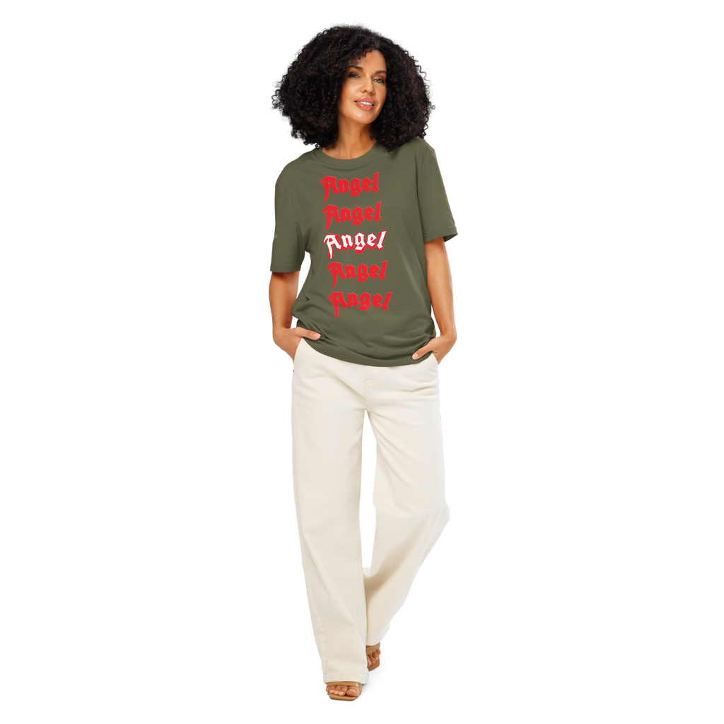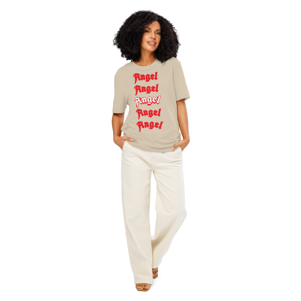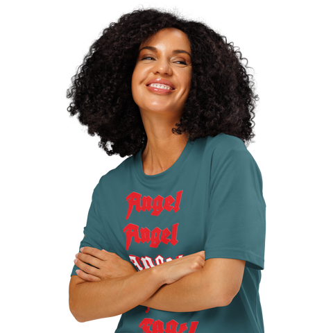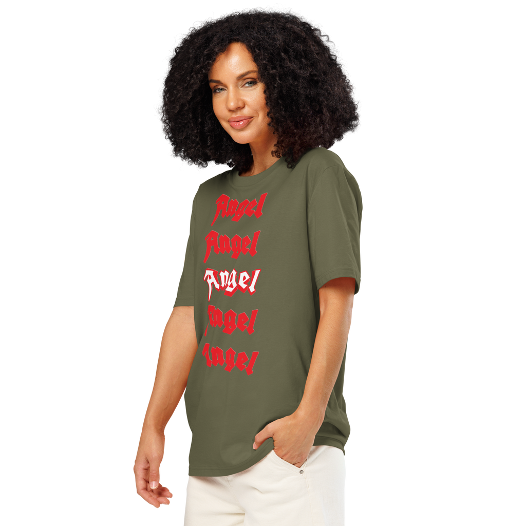• Gothic Angel Stack Design Five bold red Angel prints layered in vertical alignment—symbolizing grace, defiance, and hidden truth