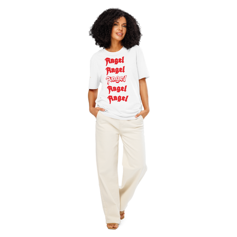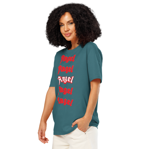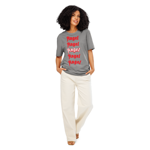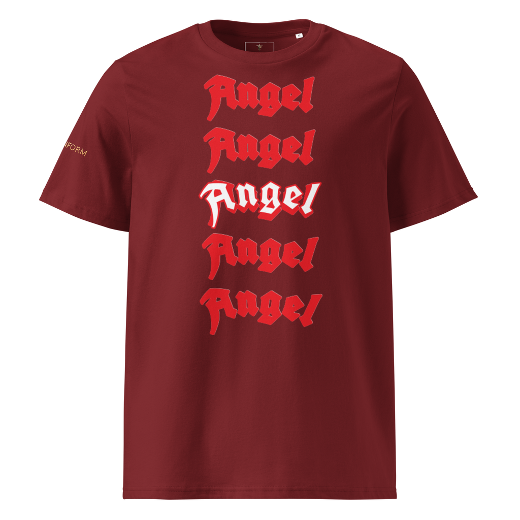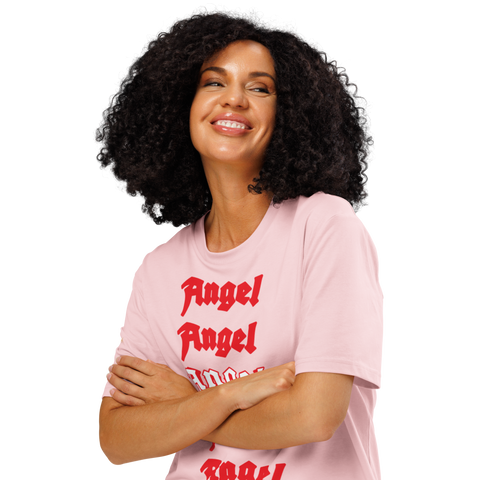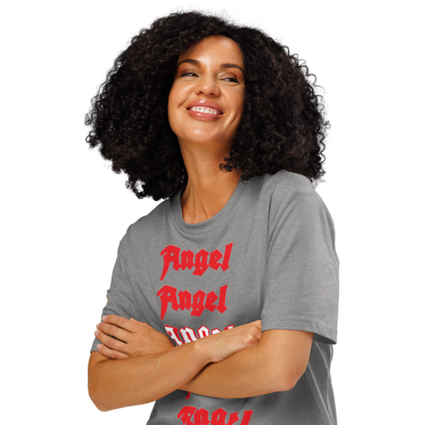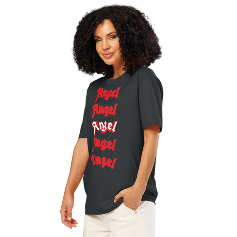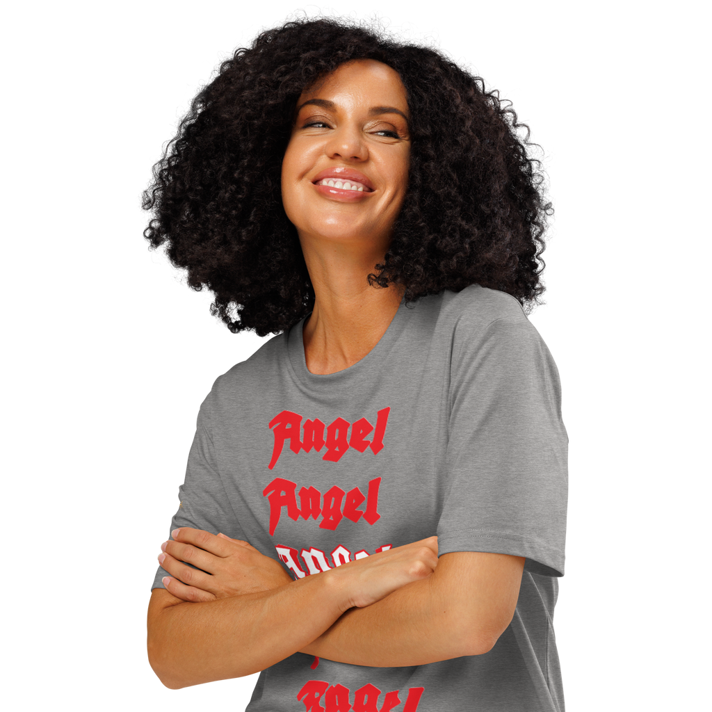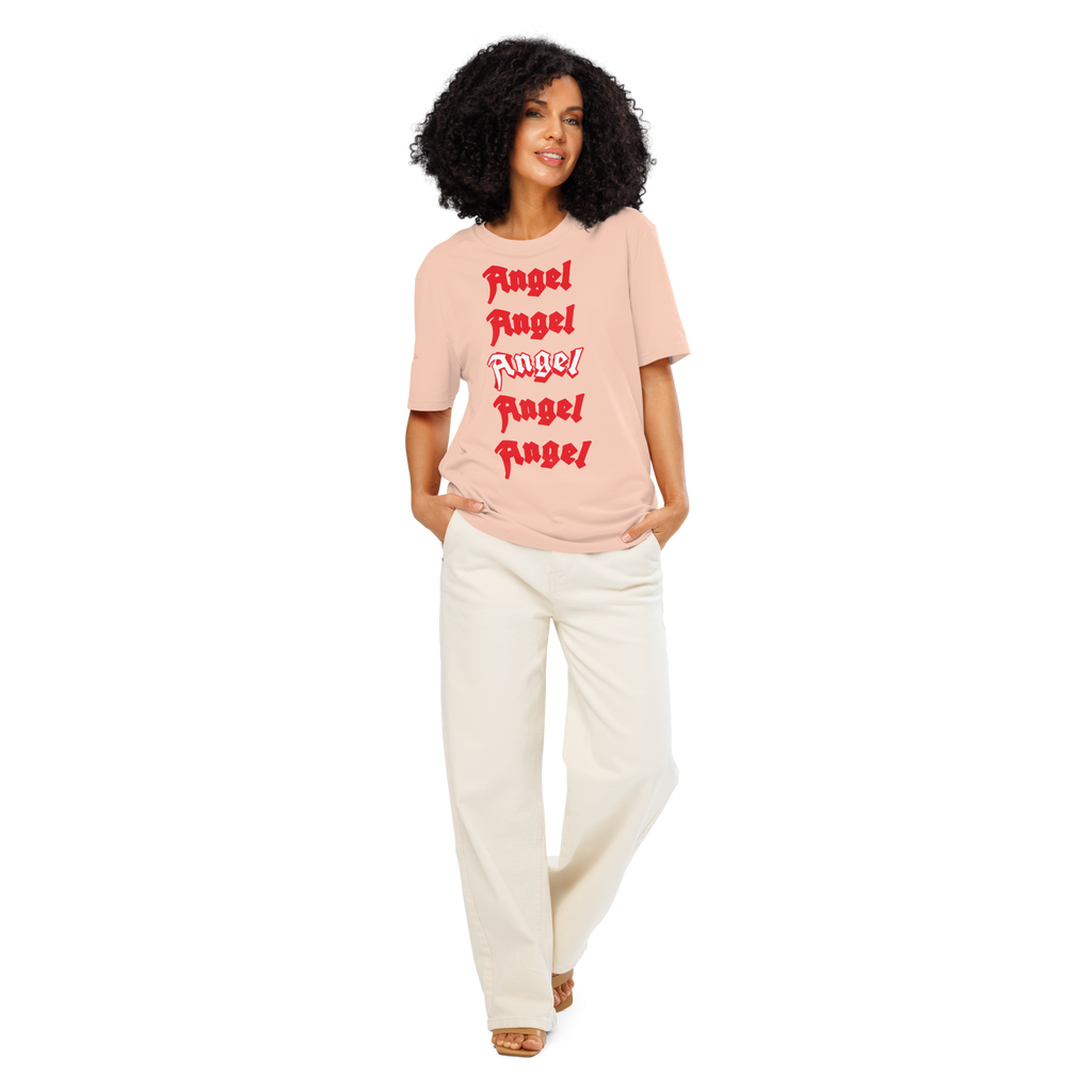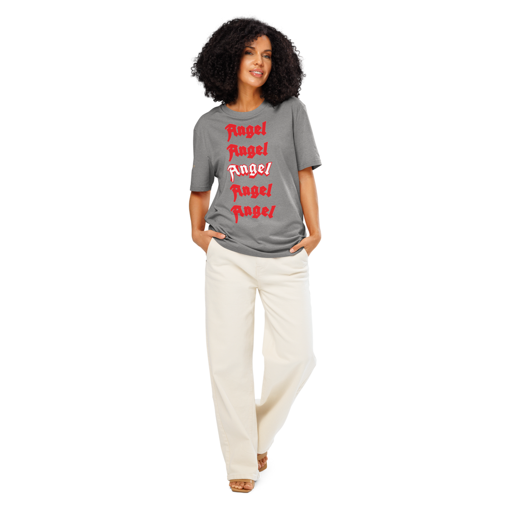 • Gothic Angel Stack Design Five bold red Angel prints layered in vertical alignment—symbolizing grace, defiance, and hidden truth