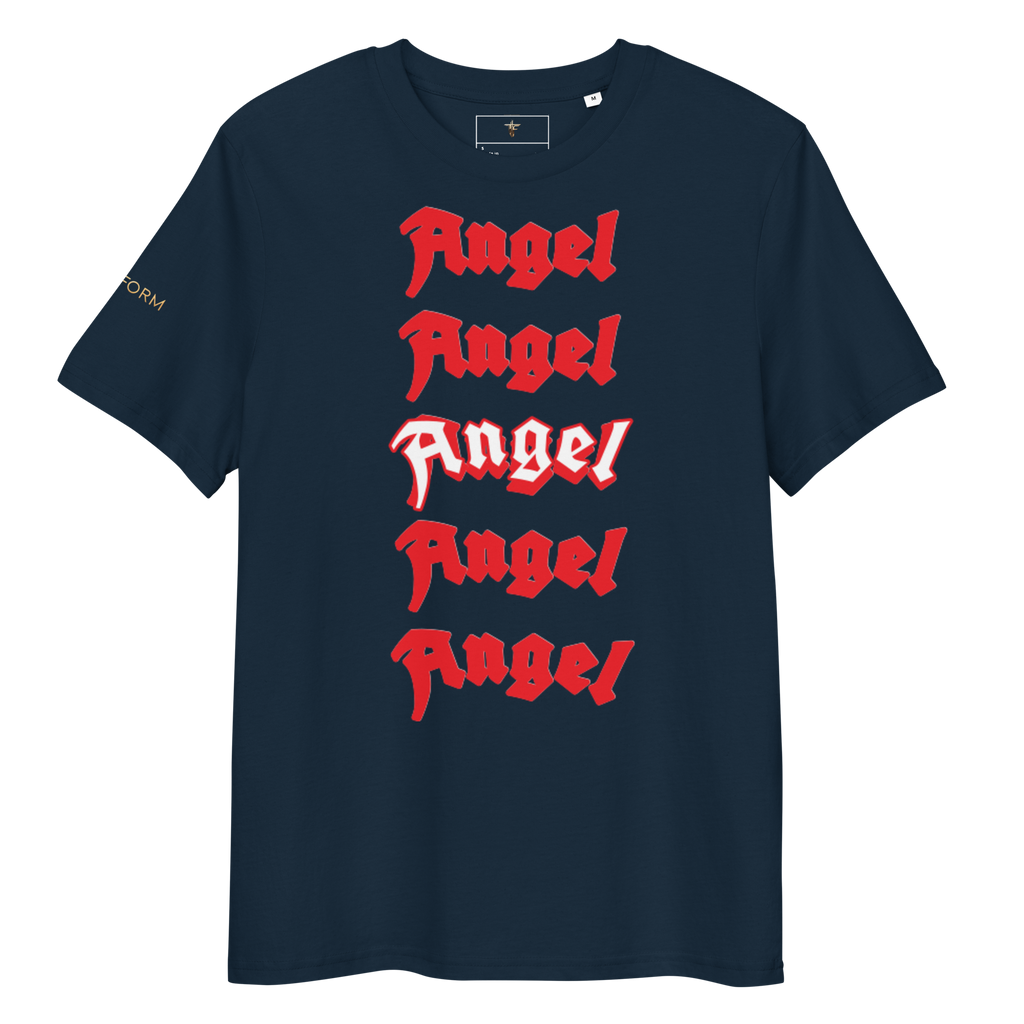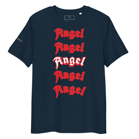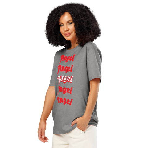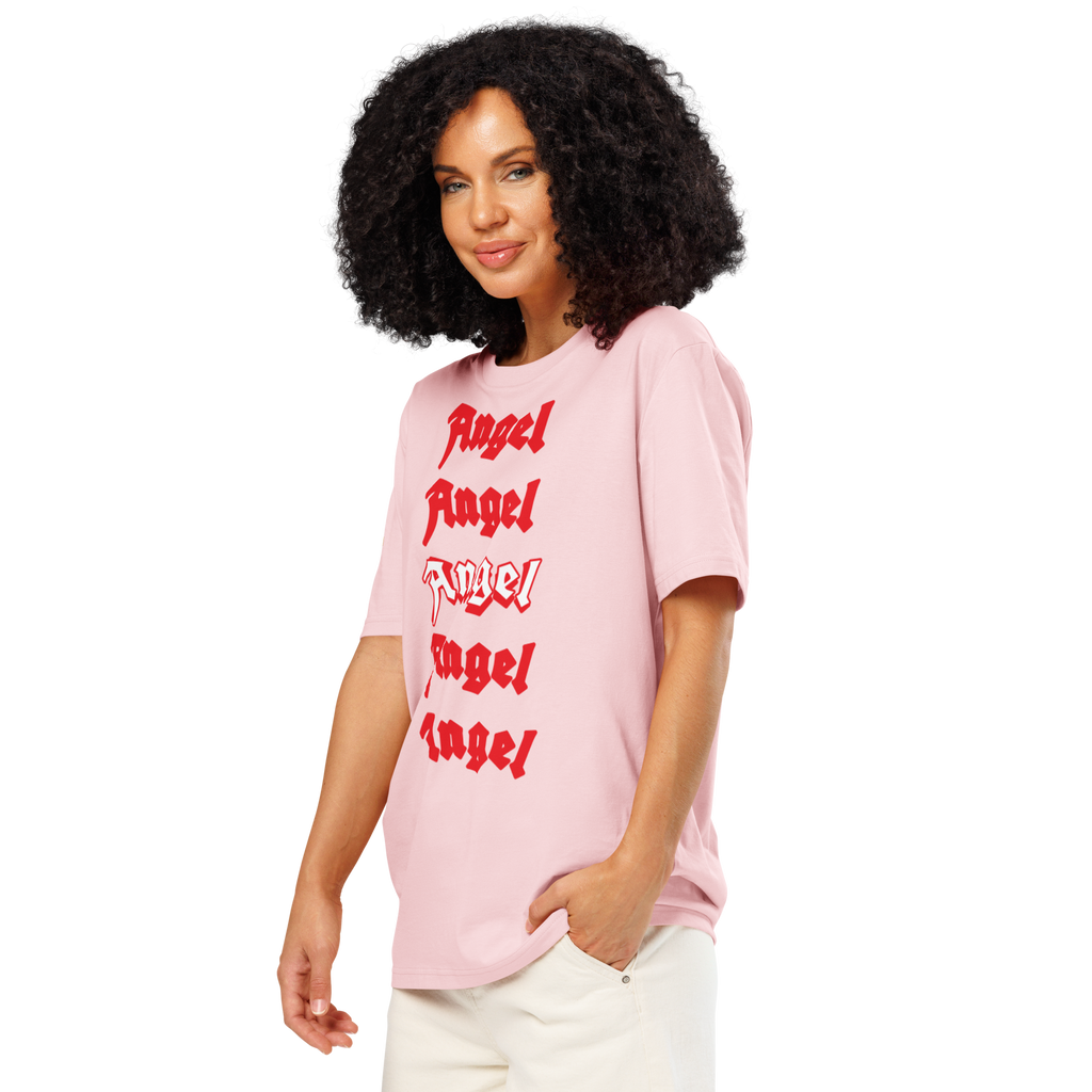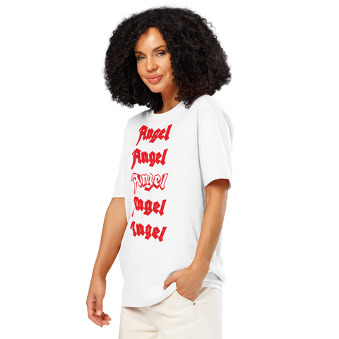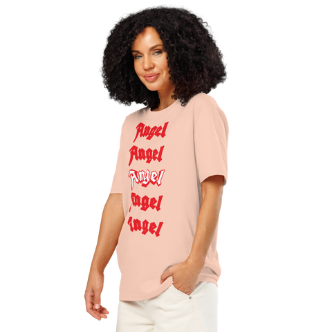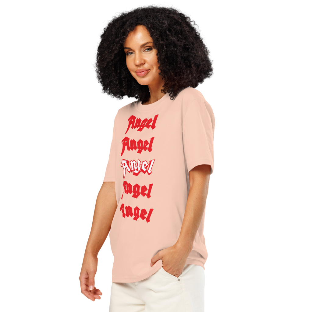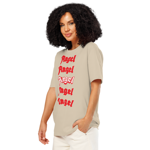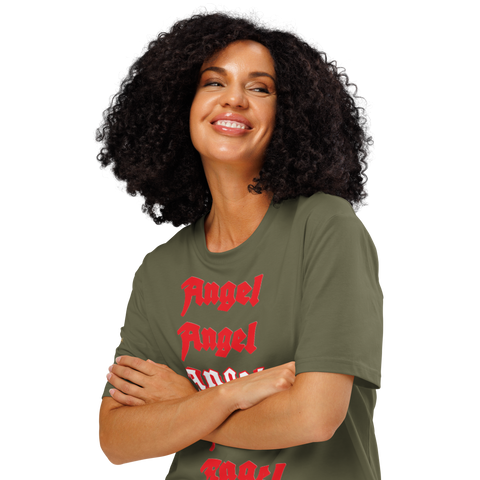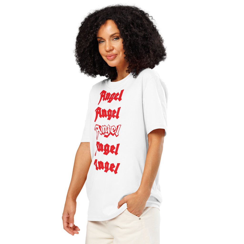 • Gothic Angel Stack Design Five bold red Angel prints layered in vertical alignment—symbolizing grace, defiance, and hidden truth