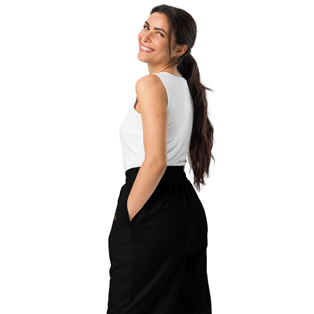 The flowing wide-leg cut enhances graceful movement and silhouette, offering a relaxed yet tailored fit that adapts to every occasion. The elastic waistband with a sleek drawstring provides an adjustable, secure fit, while deep side pockets add both practicality and style. Crafted from premium lightweight fabric, these joggers deliver unmatched comfort, breathability, and fluidity, making them the ultimate statement piece for those who embrace luxury with movement.